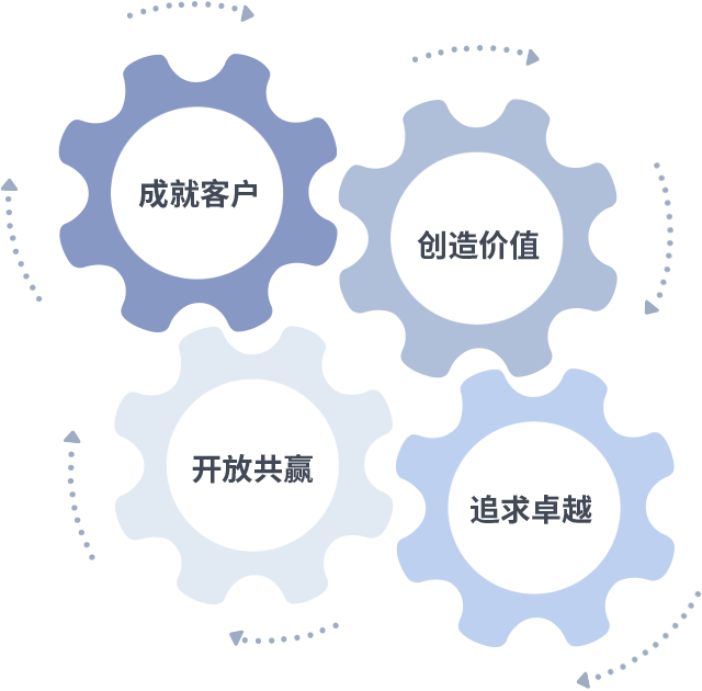 成就客户是一切决策的出发点,创造价值是衡量所有工作的标准,追求卓越是九游会J9.com做事做人的态度,开放共赢是九游会J9.com的格局也是最终的结果。价值观的齿轮环环相扣,推动着组织里的每个人不断向前。